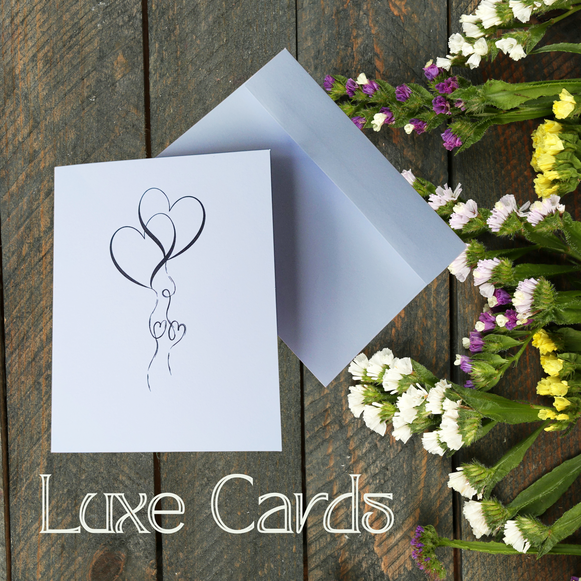 We also offer a Luxe Card Option: A stylish modern heart graphic hints at the big reveal of your Save the Date. Cards have matching envelopes that are larger than the original (4.25" x 5.5") and the interior remains blank to allow for a personal note.
